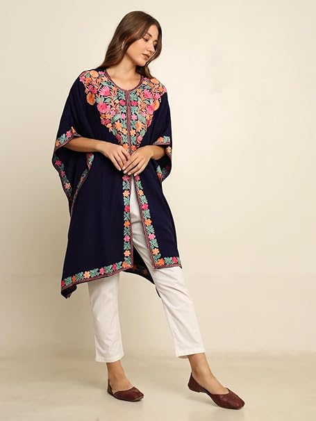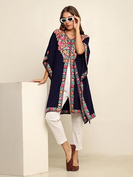 Embrace the vibrant hues of nature with this elegant floral embroidered cape from India. Crafted from lightweight and breathable fabric, this versatile garment offers a loose and comfortable fit, making it perfect for all seasons. The intricate floral motifs in shades of pink, orange, and green create a mesmerising pattern that adorns the Blue canvas. Drape this cape over your ensemble to elevate your look with a touch of ethnic charm. Whether paired with jeans or traditional attire, this captivating piece adds a touch of sophistication to your wardrobe. Indulge in the timeless allure of Indian craftsmanship and make a statement with this exquisite floral embroidered cape.