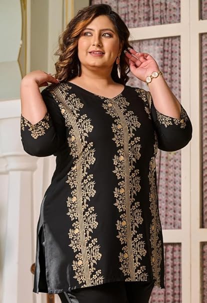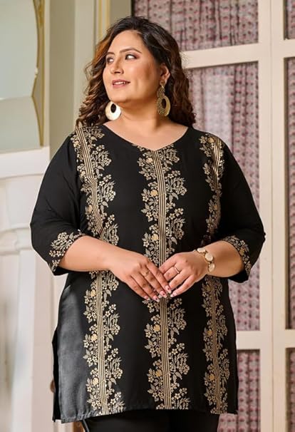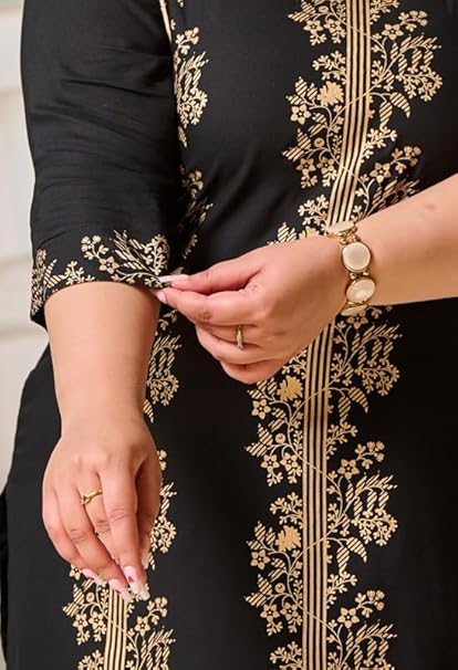 - Tunic Fabric: Rayon || Bottom Fabric: Rayon || Co-Ord Set Color: Black with Gold with Gold Panel Print || Product Care Description: Hand Wash Only || Sleeves: 3/4 Sleeves || Neck Style: V-Neck || Top Pattern: Panel Printing || Bottom Pattern: Solid