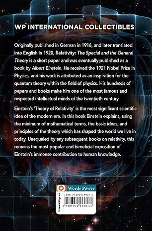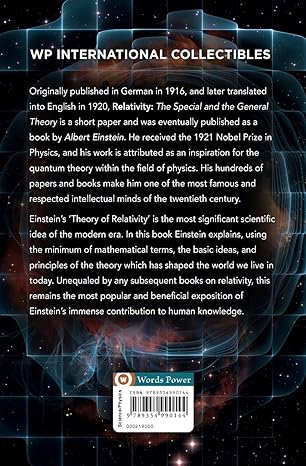 First published in German in 1916, and later translated into English in 1920, ‘Relativity: The Special and the General Theory’ is a short paper and was eventually published as a book by Albert Einstein, German-born, best known for his work on the theory of Relativity, gaining him the title of ‘Father of Modern Physics’. He received the 1921 Nobel Prize in Physics, and his work is attributed as an inspiration for the quantum theory within the field of physics. His hundreds of papers and books are highly original and intelligent, making him one of the most famous and respected intellectual minds of the twentieth century. Einstein’s ‘Theory of Relativity’ is the most significant scientific idea of the modern era. In this book Einstein explains, using the minimum of mathematical terms, the basic ideas, and principles of the theory which has shaped the world we live in today. Unequaled by any subsequent books on relativity, this remains the most popular and beneficial exposition of Einstein’s immense contribution to human knowledge. It is divided into 3 parts, the first dealing with special relativity, the second dealing with general relativity, and the third dealing with considerations on the universe as a whole. In this work Einstein intended, as far as possible, to give an accurate insight into the theory of relativity to those readers who, from a general and scientific-philosophical point of view, are curious in the theory, but who are not conversant with the mathematical apparatus of theoretical physics. The theory of relativity enriched physics and astronomy during the 20th century.