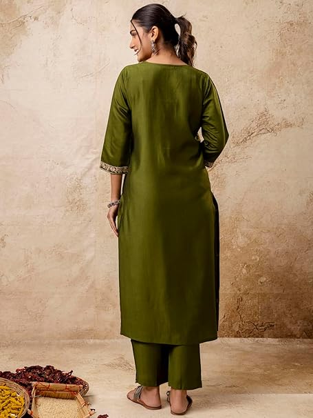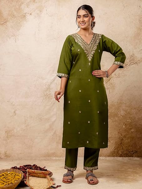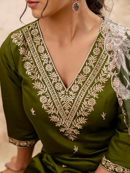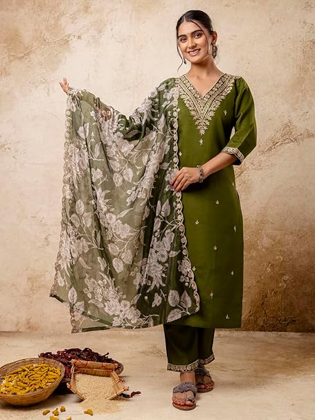 - Sleeves: Three Quarter Sleeve || Neck Type: V-Shape || Set Type: Kurta Pant & Dupatta || Sizes: S, M, L, XL, 2XL